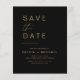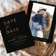 Cartões de Save the Date de casamento econômicos, elegantes, pretos e dourados que têm uma foto na frente. Os cartões de Save the Date contêm uma tipografia moderna de letra cursiva manuscrita que são elegantes, simples e modernas para usar após a sua celebração de casamento minimalista simples.
