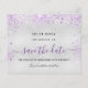 Por favor, note que esta data está no papel folheto e muito fina. Os envelopes não estão incluídos. Para placas mais grossas (mesmo design) visite nossa loja. Uma moda e moda Salve a data para uma festa de aniversário 40th (ou qualquer idade). Um fundo metálico moderno, falso e prateado, decorado com pó de brilho púrpura. Personalize e adicione uma data e nome/idade 40. Letras pretas e roxas coloridas. O texto: Salvar a Data é gravado com um script de estilo com letra de tendência grande.