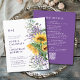 Orçamento Tudo em Uma Cores d'água, Girassol e Lavanda Monograma Folheto de Convite de Casamento... Símbolo girassol: felicidade, alegria, amor duradouro. Símbolo da flor da lavanda: amor e devoção, calma. Nosso convite para o casamento floral no flyer do orçamento "All in One" apresenta um belo buquê de girassóis e lavandas que exibem as iniciais da noiva e do monograma do noivo e o texto do convite ao seu lado. A lavanda escura do convite contém todos os detalhes que você normalmente veria em cartões separados dentro do pacote de casamento. Este convite de casamento de dois lados do estilo moderno foi projetado para ser elegante e consciente do orçamento... para não falar em economia de tempo. No verso, há também um gráfico de código QR que você pode substituir por seu próprio código digitando o URL do seu site de casamento no modelo de personalização. Todo texto de exemplo pode ser facilmente revisado com suas próprias informações no mesmo modelo. **POR FAVOR: O documento orçamental "Flyer" não é o mesmo que os convites tradicionais de cartão simples ou até mesmo os nossos convites orçamentais de 110 lb. A opção de folheto é a menos cara de nossos convites, com papel de 80 lb (semelhante ao papel de folheto) comparado com cartões planos de convite de casamento tradicionais a 5 x 7 polegadas em papel matte a 120 lb de peso. Além disso, os convites orçamentários não vêm automaticamente com envelopes, assim como os cartões de convite tradicionais, mas você pode comprá-los na mesma página no check-out, se desejar.