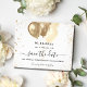 Observe que esta opção Save the date (Salvar a data) está no papel do folheto e muito fina. Os envelopes não estão incluídos. Para salvar o cartão Data (mesmo design) mais espesso, visite nossa loja. Um fundo branco chic decorado com falso brilho dourado e balões. Personalize e adicione uma data e nome/idade. O texto: Salvar a Data é gravado com um script de estilo com letra de tendência grande.