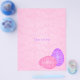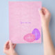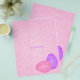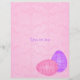 Um ovo de Páscoa cor-de-rosa, deitado do lado em frente a um ovo de lavanda ornamentado direito sobre um fundo rosa texturizado sobre panfletos. Adicione seu próprio texto.