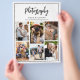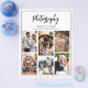 Panfleto de colagem de fotos de pacotes de fotografia moderna e trendy com preços. O design apresenta 6 fotos, tipografia ''fotografia'', seu nome ou nome do estúdio e site na frente. Personalize ainda mais com 3 fotos adicionais de portfólio, guia de pacotes e preços, código QR, seu logotipo e mídias sociais no verso. O modelo de lista de preços de fotografia permite exibir de forma fácil e eficaz os pacotes de fotografia que você oferece.
