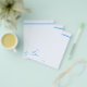 Papel de papelaria personalizado que apresenta um pássaro azul em um membro da árvore no canto inferior esquerdo e uma faixa azul no topo. Misture e combine nossas páginas de papelaria para fazer presentes de excelente para meninas que gostam de escrever mensagens especiais para amigos e familiares.
