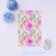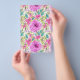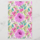Folha de plástico floral com flores cor-de-rosa e folhas verdes.