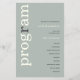 Programa de Casamento de Texto de Imersão em Papel Simples. Um alternativo PAPER (não cartão) de valor de excelente a um preço orçamentário. Um design tipográfico moderno com Programa em grande tipografia em Ivory com o "r" em cinzas, rotacionado e à esquerda sobre um fundo de verde-claro-sábio. As cores de fundo e texto podem ser alteradas se você desejar, por meio de Personalizar mais.