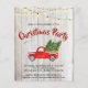 Convite de festas de Natal Russo do Caminhão Vermelho do Orçamento - Um convite festivo e rústico apresenta um caminhão de cor vermelha, monograma com sua inicial e cheio de árvores de Natal e luzes de cordas de safra penduradas. O plano de fundo do convite é de madeiras rústicas e intemporais. O convite faz parte de uma coleção. A parte de trás do convite é vermelho+búfalo+xadrez. Também disponível em verde.
