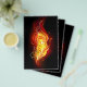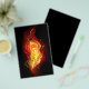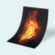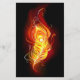 Pena de pavão brilhante feita de fogo e chamas sobre fundo negro.
