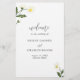 Folheto do programa de casamento floral elegante com um layout simples com margaridas pintadas por aquarela no canto superior esquerdo e canto inferior direito com "bem-vindo" em um bonito roteiro escrito à mão. As costas têm a sua ordem de cerimônia, festa de casamento e obrigado. Este moderno programa de casamento com flores margaridas é excelente para um casamento de primavera ou verão.