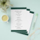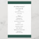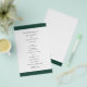 O moderno tom de joia esmeralda do programa de casamento verde esmeralda com uma banda ousada por cima e por baixo. Seus nomes estão em uma fonte serif clássica e seus detalhes estão em uma combinação de uma fonte sans serif moderna e um script elegante. A parte de trás tem uma banda ao longo do fundo junto com o seu monograma. Esta simples e mínima design com a redação tradicional é excelente para um casamento formal.