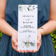 Use este design para um Programa de Casamento Z dobrado ou Triplo. Perfeito para cerimônias mais longas! Edite facilmente este programa com todas as suas informações de casamento e adicione uma foto! Este elegante design apresenta uma camada aquosa macia de eucalipto, verde e embelezamentos de ouro. Clique no botão Personalizar e "Clique para personalizar mais" para editar a cor do texto do script. Veja a coleção inteira para mais itens correspondentes!