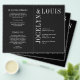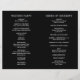 Programa moderno de casamento dobrado (impresso em papel de impressora fino e desdobrado) com um design preto minimalista com seus nomes em uma fonte grande ao longo do lado esquerdo e superior. Esta design é simples o suficiente para um casamento formal, mas faz uma declaração ousada.