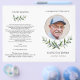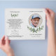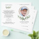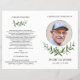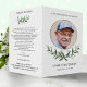 Com uma meia coroa de ramos de oliveira pacíficos, esta aquarela adorna um programa de funeral dobrável. Concebido para ser impresso em ambos os lados e depois dobrado em casa, a frente mostra o nome do falecido e você pode inserir uma fotografia favorita na moldura circular com efeito prateado, enquanto o interior pode ser editado com a ordem do serviço ou o que desejar. Em um momento difícil, este desenho de folhagem graciosa com bordas prateadas é adequado para uma celebração do serviço de vida, um serviço memorial religioso na igreja ou uma cerimônia humanista. O efeito de folha prateada FAUX é impresso e NÃO é metálico.