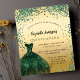 Por favor, note que este convite está no papel de folheto e é muito fino. Os envelopes não estão incluídos. Para convites mais espessos (mesmo design) visite nossa loja. Um convite moderno, na moda e glamouroso para uma Quinceañera, festa de aniversário 15. Na frente: Um fundo de ouro falso com um confete verde, um vestido verde esmeralda. O nome é escrito com um moderno estilo escrito à mão. Personalize e adicione os detalhes da sua festa.