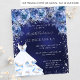 Por favor, note que este convite está no papel de folheto e é muito fino. Os envelopes não estão incluídos. Para convites mais espessos (mesmo design) visite nossa loja. Um convite moderno, na moda e glamouroso para uma Quinceañera, festa de aniversário 15. Um fundo de marinho com brilhos falso prateados, um vestido e rosas azuis, florais. A cor de fundo azul é irregular. O nome é escrito com um moderno estilo escrito à mão. Personalize e adicione os detalhes da sua festa.