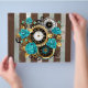 Relógio antigo e patenteado, adornado com joias, mãos de ouro e algarismos latinos com rosa de turquesa sobre fundo castanho e listrado. Estilo Steampunk.