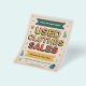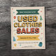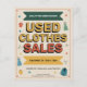 A retro-style promotional flyer for a used clothing sale featuring bold retro typography, colorful design elements, hangers, stars and illustrated clothing items like floral dress, shirts, hangers and jacket in vintage pastel colors.