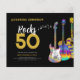 Rocks personalizados 50º convites de festas de aniversários com três designs legal de guitarra de aquarela. Uma guitarra elétrica com padrão colorido e guarda branca para picadas, uma guitarra semisacústica multicolorida e uma ilustração de arte acústica clássica psicodélica com tipografia legal personalizada negra e dourada. Esse modelo fácil de usar cria o convite perfeito para celebrar cinquenta no estilo rock n roll e é ideal para um guitarrista, músico e amante da música. Qualquer guitarrista lhe dirá que você nunca pode ter muitas guitarras. Este legal instrumento musical moderno design comemora a energia musical deste maravilhoso instrumento musical e é a forma perfeita de celebrar o quinquagésimo aniversário. Arte original da artista Catherine Sweetman