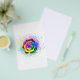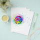 Rosa grande e florescente com pétalas arco-íris sobre fundo branco, pintadas com pedaços de tinta colorida e brilhante. 3d