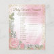 Jogos para chá de bebê rosa e dourado com palavras embaralhadas de bebê de um lado e quiz de parlendas do outro. Este adorável folheto de jogo de chá de bebê menina rosa e dourado com rosas e buquê de bebê é divertido e econômico! Você pode escolher o tamanho e o estilo do papel e pode adicionar suas próprias palavras e rimas. Aqui estão as respostas para os jogos: