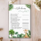 Prepare-se para algumas risadas com este folheto de jogos "Quem conhece melhor a Mamãe"! Apresentando um adorável animal safari — girafa — rodeado por folhas tropicais exuberantes, este design define o tom perfeito para um chá de fraldas com tema de selva. É uma maneira divertida de entreter convidados e celebrar a futura mãe!