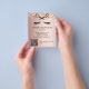 Um fundo gradiente rosa dourado, com brilhos cintilantes, tesoura preta e cílios. Na frente: O texto: Lista de preços. Personalize e adicione seu nome e endereço. Crie seu próprio código QR adicionando a url do seu site ou da sua conta de mídia social.