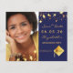 Observe que esta opção Salvar a data está no papel do folheto e muito fina. Os envelopes não estão incluídos. Para placas mais grossas (mesmo design) visite nossa loja. Uma foto Salve a data de uma festa de formatura. Na frente: adicione sua própria foto vertical do formando. Uma cor azul de fundo marinho chic, decorada com estrelas douradas falsas. Personalize e adicione um nome e data. Ouros. O nome e o texto: Salvar a Data são escritos com um script de estilo moderno com letra manual.