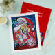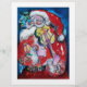 Pintura colorida, branca e artística em acrílico, Papais noeis estão tocando violino na noite de inverno nevada, coruja, ornamentos florais, plantas de inverno, bagas ocas em cores vermelho brilhante, verde, branco, azul, amarelo.