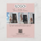 Um folheto de negócios simples, cor-de-rosa, que permite personalizar seu logotipo de negócios, título de negócios, descrição de negócios, identificador de mídia social de negócios, link de site de pesquisa de código QR de negócios, detalhes de contato de negócios etc. Um perfeito modelo de folheto comercial para todos os tipos de negócios. Personalize este folheto profissional e torne-o seu! Modelo de panfleto perfeito para beleza, cabelo, unhas, salões de maquilhagem, etc.