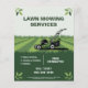 Um folheto de serviços de corte de grama profissional com design vibrante, com pequenos acentos de folhas nos cantos. O centro apresenta uma ilustração de um gramado perfeitamente cuidado com linhas de corte nítidas e um cortador de grama. Pode ser adequado para serviços de cuidado com gramados e jardinagem profissional ou pessoas que trabalham no campo da paisagem, como paisagista, cortando e mantendo o gramado, mantendo espaços verdes, etc.