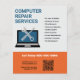 Um folheto de serviços profissionais de reparação de computadores com um layout limpo apresentando um toque de cor laranja e incluindo uma lista de serviços e um código QR! O design apresenta uma ilustração de um computador portátil com uma chave inglesa e uma chave de fenda cruzadas. Perfeito para atividades como técnico de TI, suporte de hardware e software, atualizações, manutenção e mais, seja na loja ou no local.