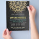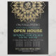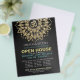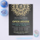 Elegante YOGA Meditation Instructor Studio Open House Flyer Modelo - Elegante Gold Foil Mandala Floral e Om Symbol on Dark Black Texture.