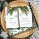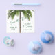 Palmeira tropical, orçamento para salvar a data do anúncio de casamento impresso no papel folheto. Uma palmeira de solteiro no centro de cartas brancas com frondes de palma penduradas sobre o texto. O texto "Salvar a data" é alterado. A data está em um lado do tronco com nomes e localização do evento no outro. As costas têm um padrão de folhas tropicais em tons de verde. A cor é verde e branca para um design simples e limpo.