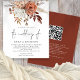 Um alternativo PAPER (não cartão) com preço de valor de excelente com tamanho PEQUENO de 4,5" x 5,6" sem envelopes - envelopes padrão A6 são o tamanho mais próximo ao ajustado. Rustic Terracotta Florals QR Code Wedding. As flores, bagas e gramíneas legantes, em cor de outono, terracotta marrom e creme, fluem do topo. O Casamento de está em um roteiro de estilo de escrita manual. Personalize facilmente o resto do texto para seus próprios detalhes. Adicione seu código QR ao seu site de casamento no verso faz com que esta seja uma opção conveniente para seus convidados para RSVP e veja todos os detalhes sem a necessidade de RSVP separado e cartões de detalhes. Seu código QR será gerado automaticamente para atualizar o código de amostra no design, quando você simplesmente alterar o URL de amostra no modelo com o URL do seu próprio site de casamento.