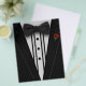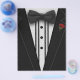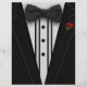 Um smoking preto com arco e rosa vermelha.