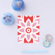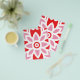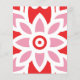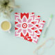 O design apresenta um padrão simétrico com uma combinação de cores vermelha e branca. No centro, há um design floral estilizado com camadas de pétalas radiando para fora. Ao redor deste motivo central estão elementos giratórios e formas decorativas adicionais, criando um aspecto equilibrado e harmonioso. O uso de apenas duas cores faz o intrincado design se destacar maravilhosamente.