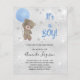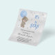 Por favor, note que este convite está no papel de folheto e é muito fino. Os envelopes não estão incluídos. Para convites mais espessos (mesmo design) visite nossa loja. Para um chá de fraldas celebrando um menino. Um fundo metálico falso prateado. Um ursinho de pelúcia segurando estrelas de balões azuis e poeira brilhante fraca. Personalize e adicione o nome da mãe a ser e os detalhes da festa. O nome e o texto: É um Rapaz! são escritos com um estilo escrito à mão