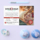 Marketing flyer for with warm red details for a spa, salon, massage therapist or more with your photos, logo, and QR code. Add your text, your services, a discount offer, contact info, address, opening hours, an about text, social media and more. Promotional spa flyer personalized with text, logo, photos, and QR code to hand out to potential customers and clients with information about your small business, discount offers, and more in a timeless design with details in a warm shade of carnelian red.
