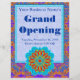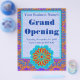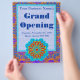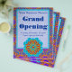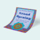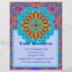 design de abstrato - centro de flores vermelho e laranja, rodeado por uma borda azul arredondada, com um padrão design de vinha verde à volta. Com um fundo floral abstrato cor de roxo/laranja, padronizado.