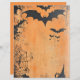 This vintage-inspired Halloween scrapbook paper features a rustic orange background and silhouetted black bats in flight. The junk journal-style backdrop adds nostalgic charm, capturing a classic spooky vibe. It's a festive yet haunting setting for showcasing Halloween photos and memories. The reverse side features a complementary solid orange, perfect for layering or adding warmth to your Halloween pages.
