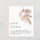 O Blush Orçamentário Deixa Novos Detalhes Domésticos. Um alternativo MENOR de 4,5" x 5,6", compatível com o orçamento. Disponível em um STOCK de PLACA SEMI GLOSS 110 lb ou um STOCK de PAPEL THINNER SATIN FINISH 80 lb. Os envelopes são um extra opcional. O cabeçalho é grande em na moda lowercase com os detalhes abaixo. Folhas esfregadas fluem do canto superior direito. Personalize facilmente o texto para seus próprios detalhes e substitua a foto de amostra no verso por sua própria foto da sua nova casa.
