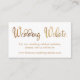 Mantenha seus convidados de casamento em contato com todos os seus detalhes com esses cartões de inserção de favor de casamento bonito. Uma camada de texto elegante foi projetada usando uma fonte moderna, casual, escrita embelezada com um efeito suave de folha de ouro. Lê-se "Site de Casamento". Use os campos modelo para personalizar com suas informações pessoais. O fundo está coberto de branco e esta cor editável pode ser alterada para qualquer coisa da paleta de casamento que você escolher; todo o texto editável aparece em uma matiz de ouro complementar que você também pode editar à medida que você vê ajustado. // 102 // Concebida por Melody Watson para Paper Muserie.