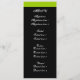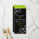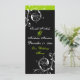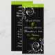 Folha de rolagem floral elegante, cartão de cardápio verde, verde, com folhas brancas de rolagem, espirais, enroladores e pontos de verde limão sobre fundo preto. Há uma banda verde no topo. Este design clássico, na moda e chic é parte de um conjunto de produtos de papel e é perfeito para um primavera ou casamento no inverno.
