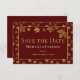 Perfeito para as comemorações do outono: convite vermelho escuro com folhas de outono com efeito folha de ouro. Todo texto pode ser personalizado neste design. Os convites e as placas estão disponíveis em uma seleção de texturas e formas de papel (borda arredondada, redimensionada etc.) Você pode encontrar outros designs com muitos produtos de coordenação na loja, incluindo convites, salvar a data e as placas rsvp, obrigado que você marcar e muito mais.