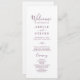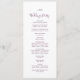 Este programa de casamento de beringela de folha é perfeito para um casamento de boho. A design apresenta uma simples silhueta verde folha em uma cor roxa escura romântica com estilo minimalista de jardim boêmico. Inclua o nome do casal, a data e o local do casamento, a mensagem do obrigado, a ordem de serviço, a festa de casamento e um memorial "em memória amorosa" opcional.