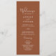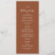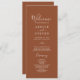 Este programa de casamento de terracotta de folha é perfeito para um casamento de boho. A design apresenta uma simples silhueta verde folha em laranja queimado com estilo minimalista de boêmia do deserto. Inclua o nome do casal, a data e o local do casamento, a mensagem do obrigado, a ordem de serviço, a festa de casamento e um memorial "em memória amorosa" opcional.