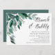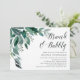 O convite para perfuração de chá de panela chic apresenta folhas e folhagem verdes de eucalipto enxutos, ilustradas em aquarela. Personalize com seus detalhes de brunch bridal alinhados à direita, com "brunch & bubble" em um roteiro elegante de caligrafia. Cartões invertidos a verde florestal sólido.