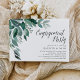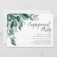 Os convites de festas de noivado botânica elegantes apresentam folhas de cor aquática de eucalipto e folhagem verde em cascata do canto superior esquerdo. Personalize com seus detalhes de celebração de noivados alinhados à direita e embelezados com o script de caligrafia. Convites invertendo ao verde florestal sólido.