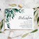 Advertências botânicas incríveis para a dedicação do seu bebê apresentam folhas verdes de eucalipto e folhagem esverdeadas, ilustradas em aquarela. Personalize com os detalhes de dedicação do seu bebê alinhados à direita e embelezados com a caligrafia. Convites invertendo ao verde florestal sólido.