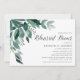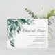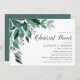 O convite para janto de ensaio botânico elegante apresenta folhas verdes de eucalipto e folhagem esverdeadas ilustradas em aquarela. Personalize com seu ensaio de cerimônia e ensaie os detalhes do janto alinhados à direita. Convites invertendo ao verde florestal sólido.