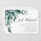 Os convites de brunch de posto botânico elegantes apresentam folhas de cor aquática de eucalipto e folhagem verde do canto superior esquerdo. Personalize com seus detalhes de brunch de casamento alinhados à direita, embelezados com "recem casados" no roteiro de caligrafia. Convites invertendo ao verde florestal sólido.